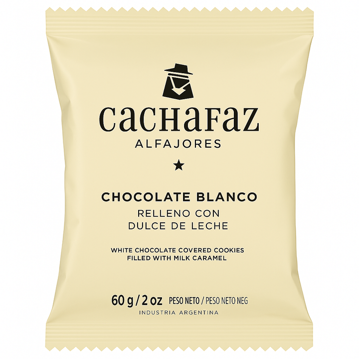 Disfruta del inconfundible sabor argentino con el pack de 3 alfajores Cachafaz de Chocolate Blanco, cada uno de 60 g. Una deliciosa combinación de suave cobertura de chocolate blanco que envuelve galletas esponjosas rellenas con cremoso dulce de leche. La textura balanceada y el sabor auténtico convierten a estos alfajores en un verdadero placer gourmet, ideales para compartir, regalar o consentirte en cualquier momento del día.
