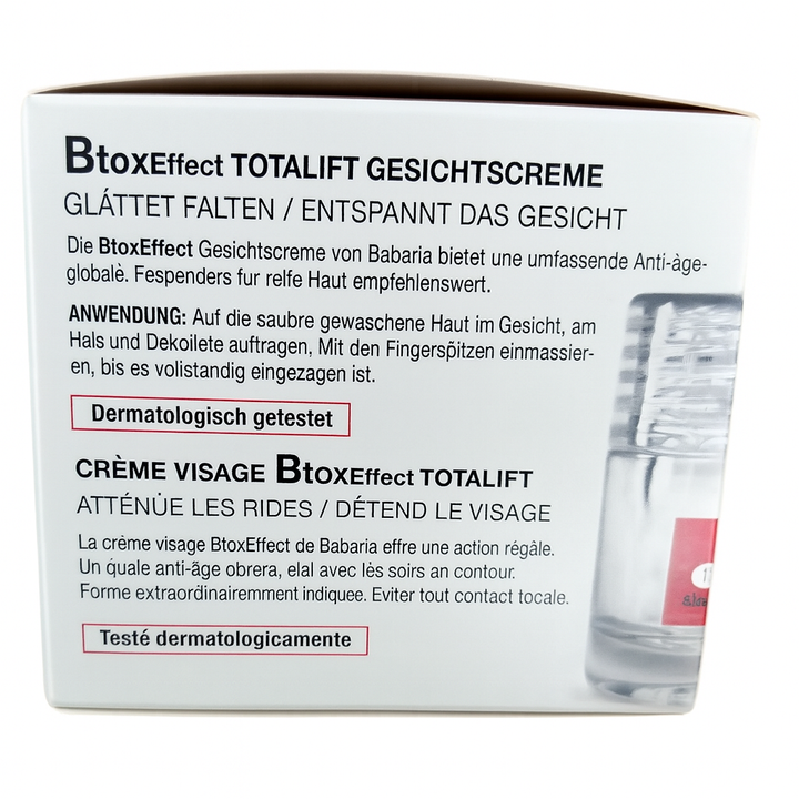 Descubre la Crema Facial Btox Effect TotaLift de Babaria, una fórmula antiedad importada de España diseñada para suavizar visiblemente las arrugas y mejorar la firmeza de la piel. Su innovador efecto tensor inmediato aporta un rostro más terso, hidratado y con apariencia rejuvenecida.